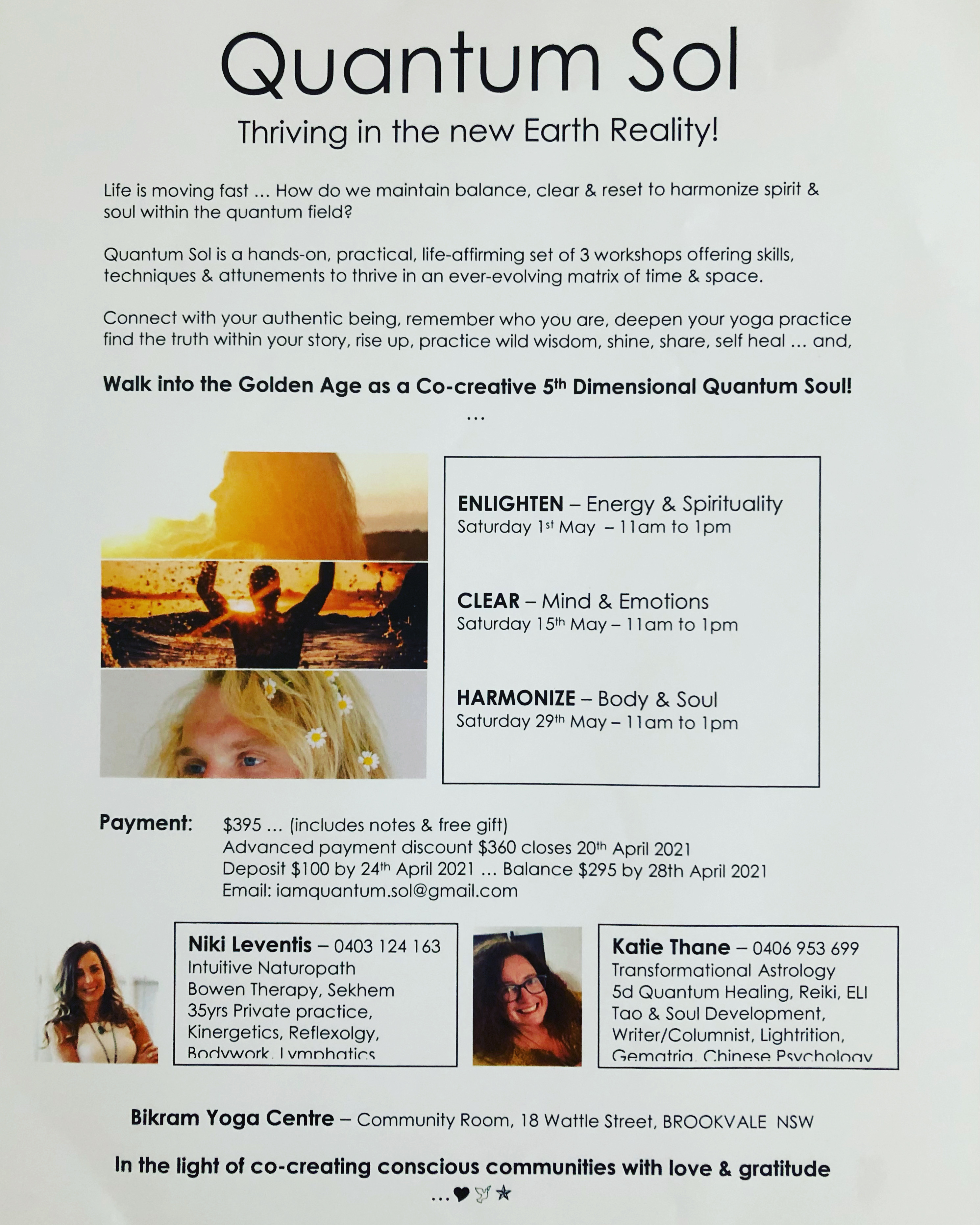 Come join Niki & myself as we collaborate to share over 30 years of our wisdom & knowledge in the light of co-creating conscious aware communities.